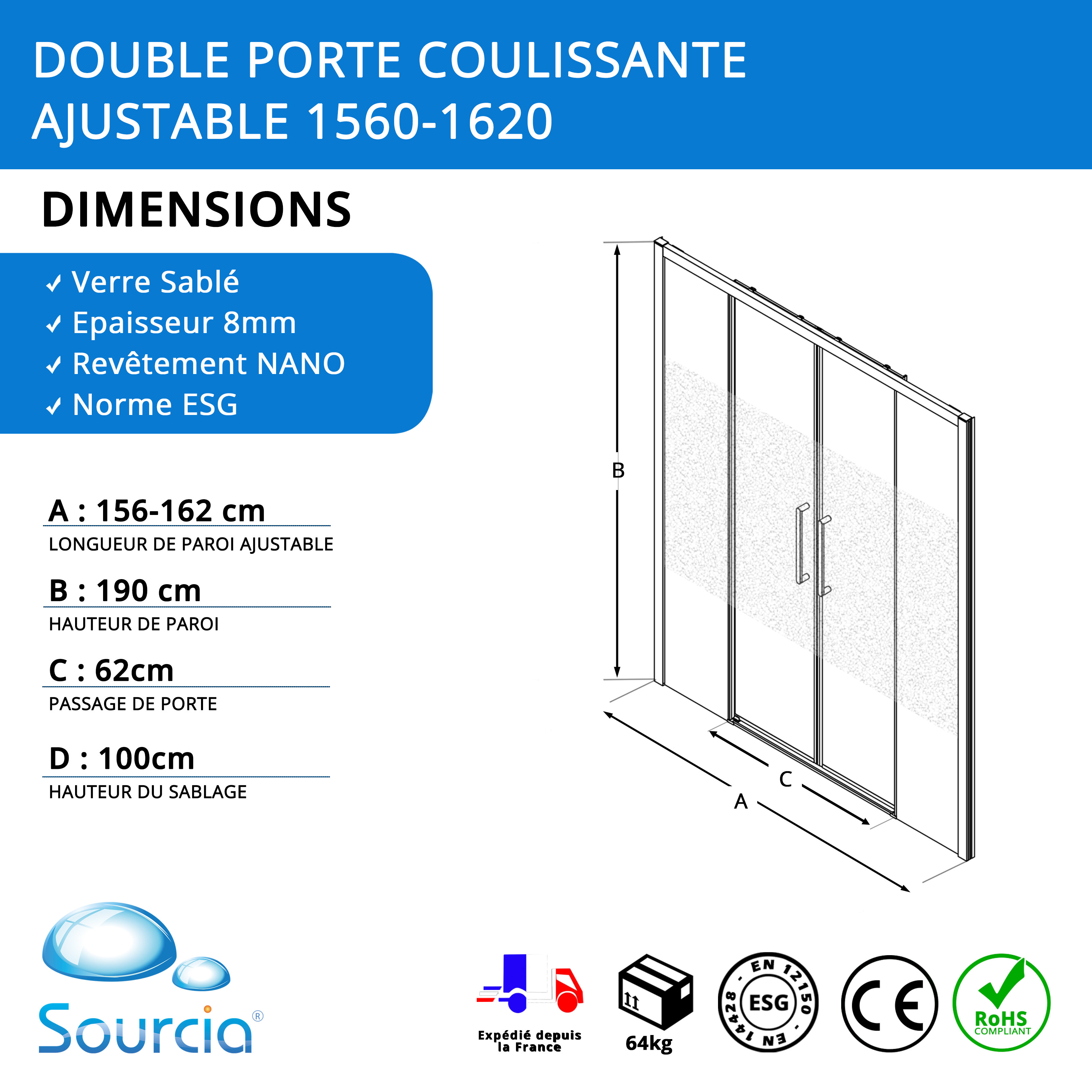 Paroi de douche 160 cm avec double porte coulissante ajustable - Sablée