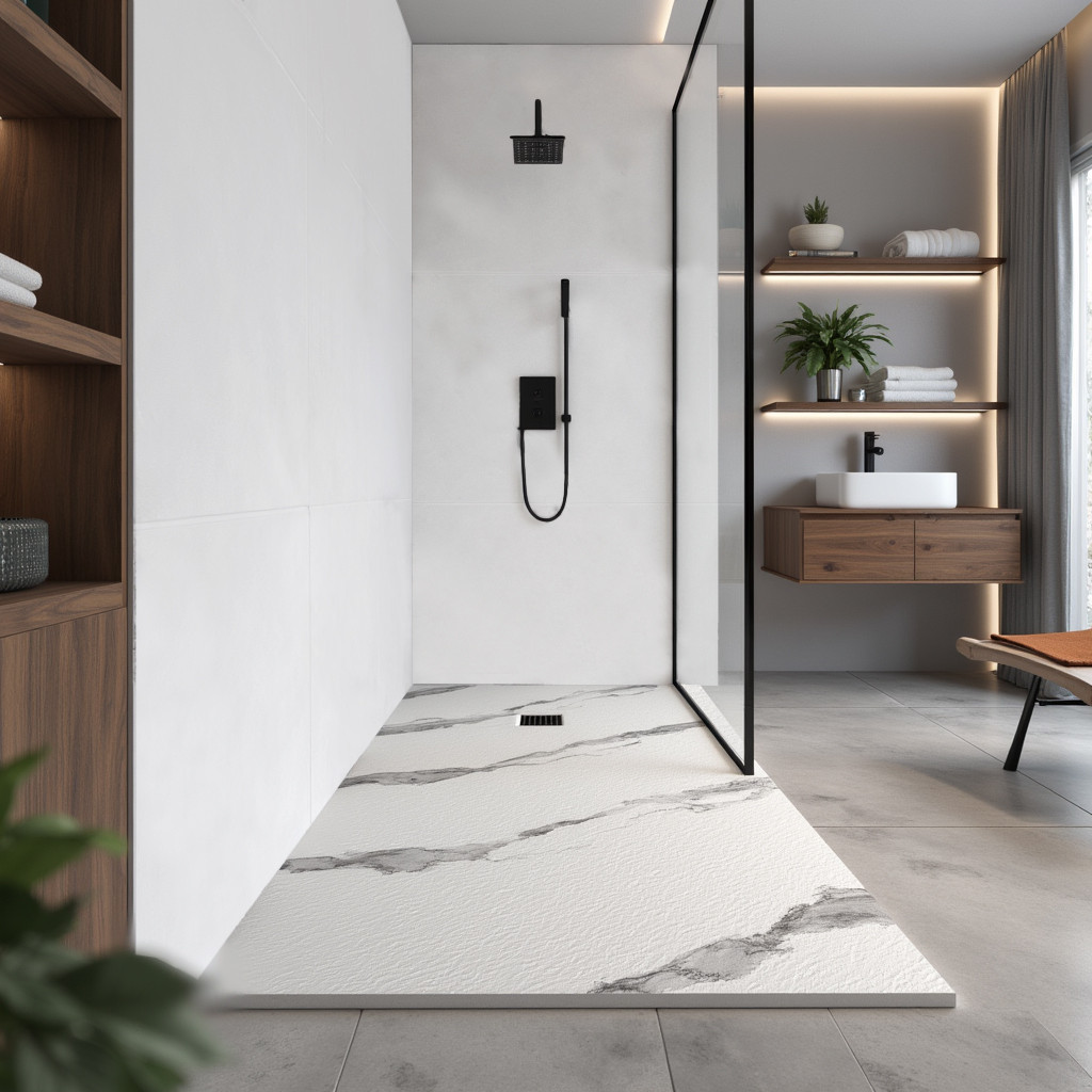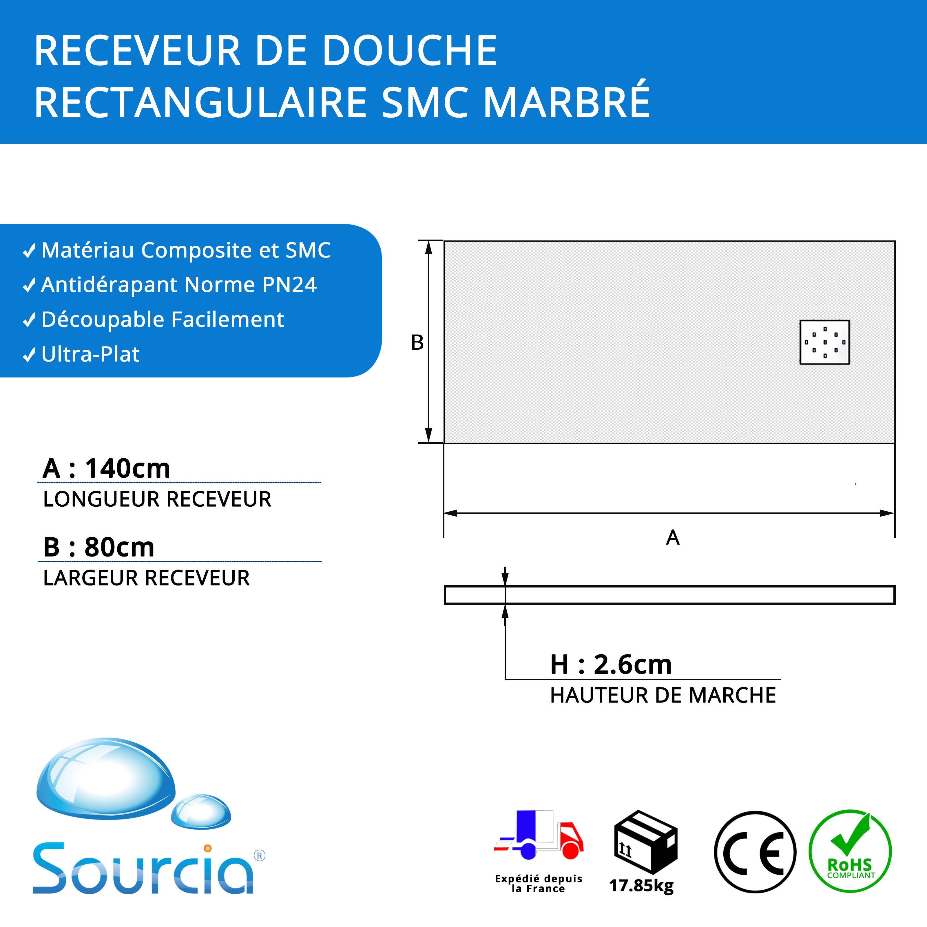 Avec ses 26 mm d’épaisseur et son poids ultra léger de 14.3 kg/m², ce receveur facilite l’accès à la douche pour les personnes à mobilité réduite. Antidérapant (PN24), il offre sécurité et confort. Son design effet marbré, moderne et découpable, s’adapte facilement à toute salle de bain. Robuste, léger, facile à poser et certifié CE, il est garanti 2 ans.